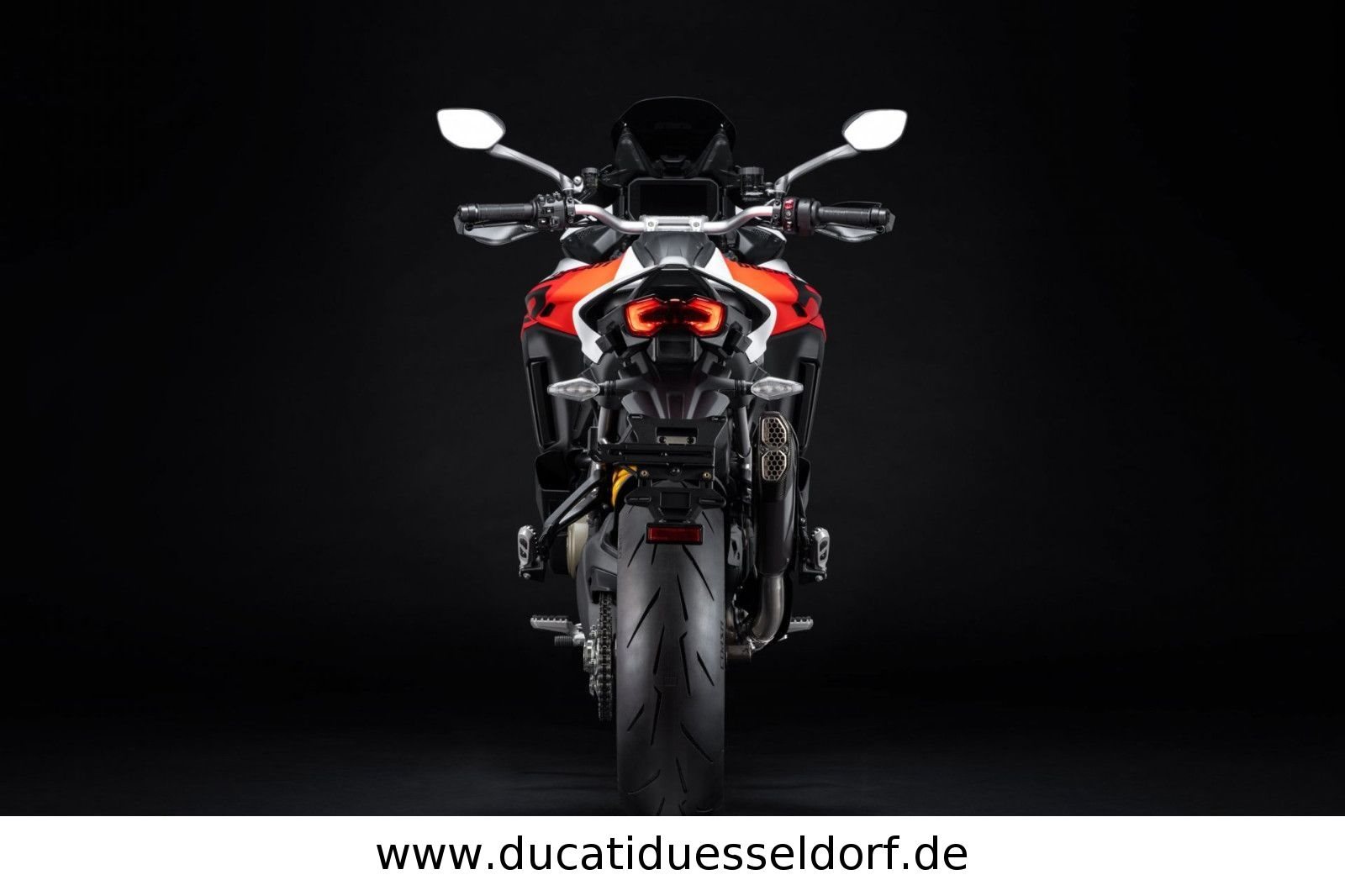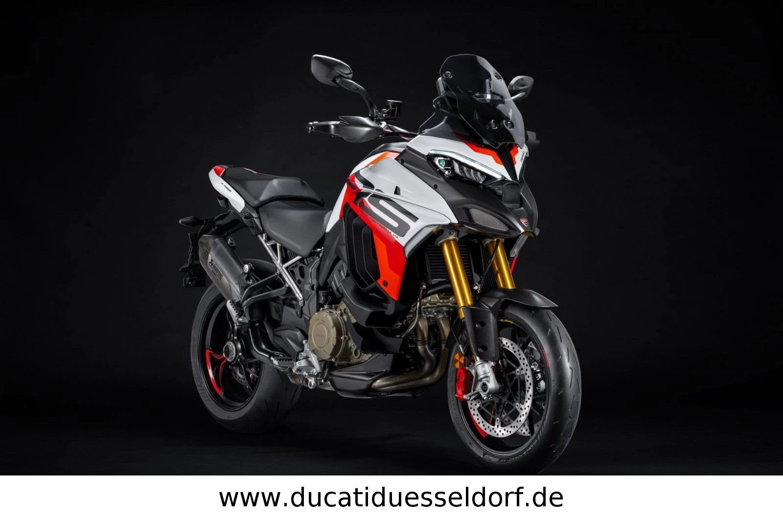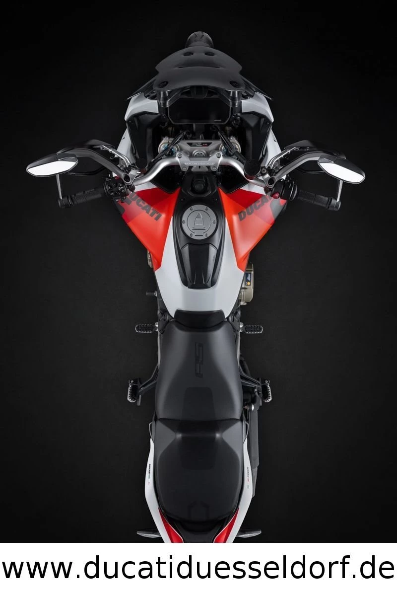 Öhlins Smart EC 2.0 (elektronische Federung), Ducati Quick Shift, Hands Free-System, beleuchtete Bedienelemente, 6,5-Zoll-TFT-Farbdisplay mit Ducati Connect und Karten-Navigation, Voll-LED-Scheinwerfer, vorderer Kotflügel und Frontverkleidung aus Carbon, Handprotektoren aus Carbon, Titan-Endschalldämpfer von Akrapovic