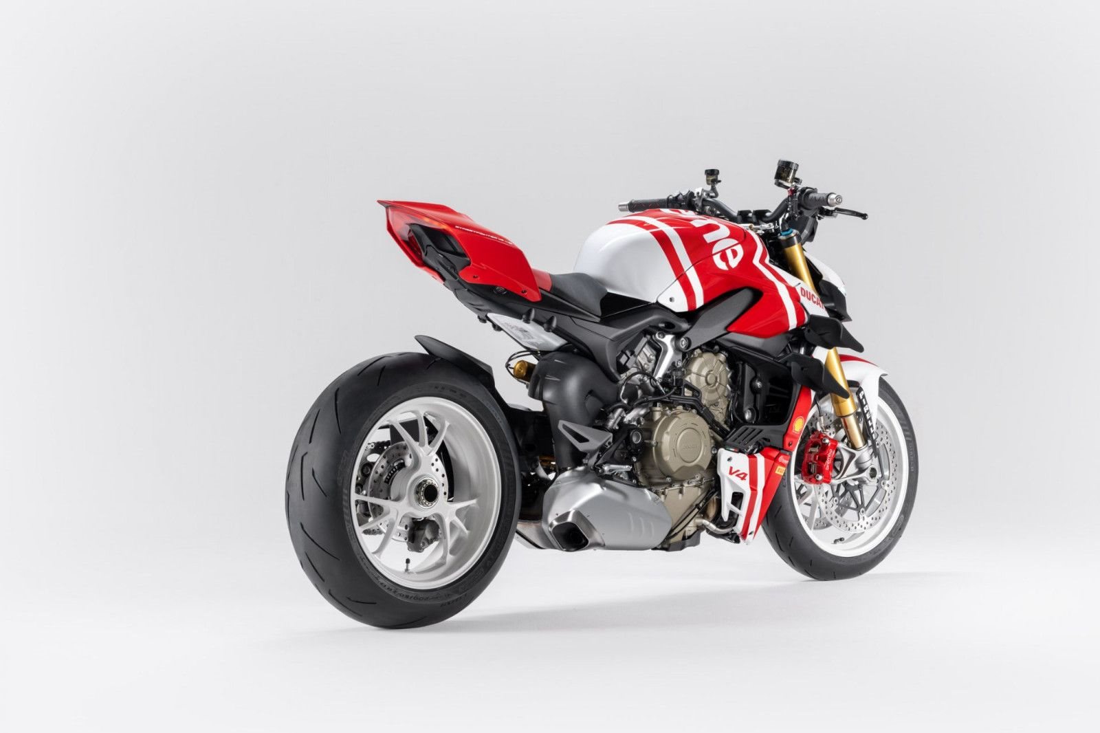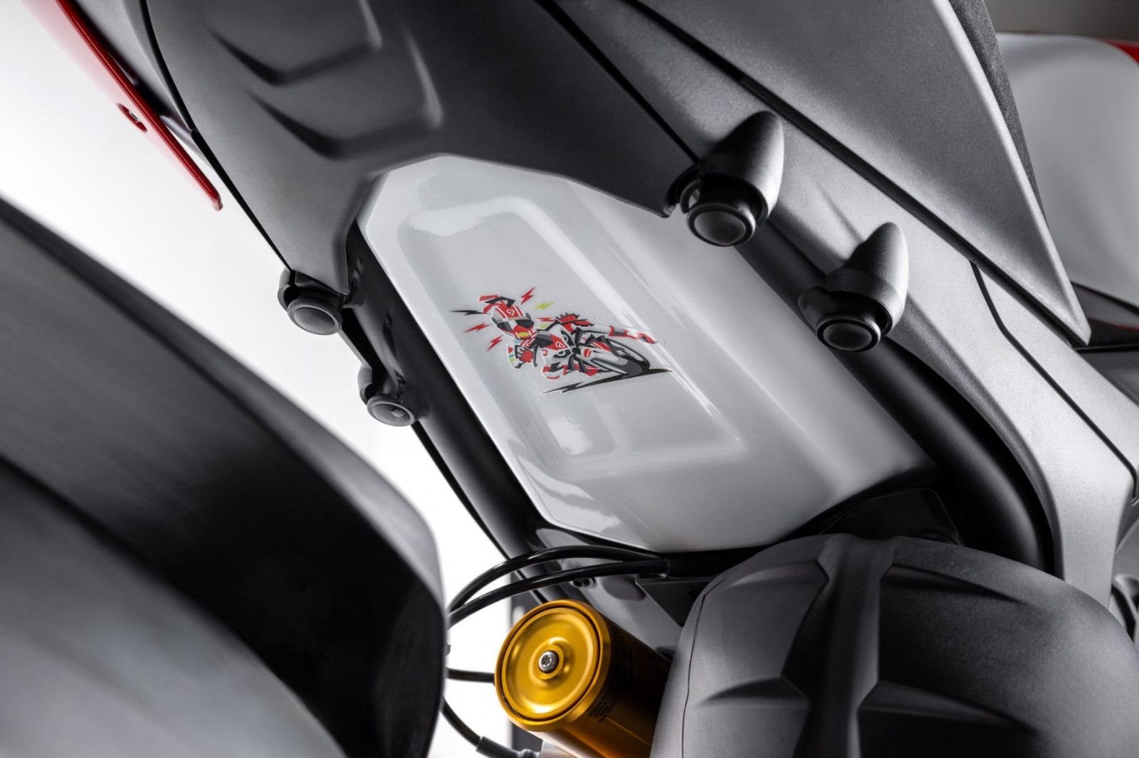 Aluminium-Räder, Lithium-Ionen-Batterie, Soziussitzabdeckung, Soziussitz und Fußrasten Kit, rot lackierte Bremssättel vorne und sportliche Griffgummis.Sicherheitsausstattung: Riding Modes, Power Modes, Kurven-ABS EVO, Ducati Traction Control (DTC) EVO 2, Ducati Wheelie Control (DWC), Ducati Slide Control (DSC), Engine Brake Control (EBC) EVO 2, automatischen Reifenkalibrierung