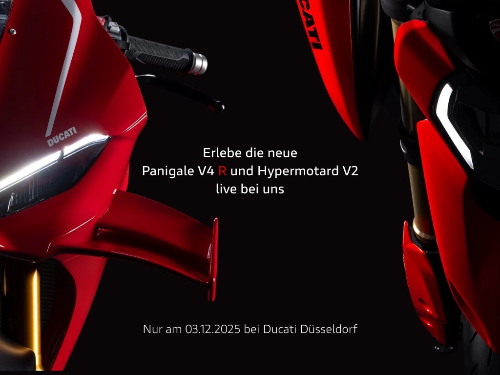 Erlebe die Zukunft des Motorradfahrens bei der exklusiven Ducati Premiere Tour! Sei vor allen anderen dabei und entdecke die neue Hypermotard V2, die mit Leichtigkeit, Agilität und charakterstarkem Design begeistert, sowie die kompromisslose Panigale V4 R als starkes Rennsport-Bike, das Höchstleistung und pure Präzision auf die Straße bringt.